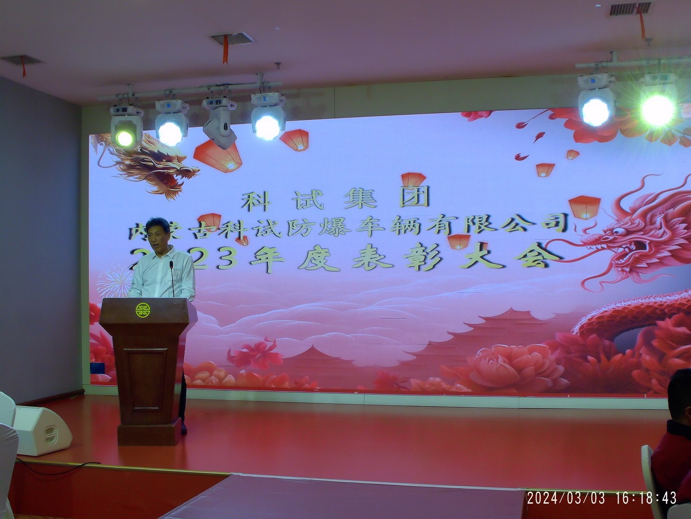在集團公司戰略的正確指引下,內蒙古科試防爆車輛有限公司逐步發展壯大,為表彰在公司發展過程中做出突出貢獻的先進個人和先進集體,樹立標桿,彰顯企業文化和企業奮進發展的精神,內蒙古科試防爆車輛有限公司第一屆總結表彰大會于2024年3月3日下午在鄂爾多斯市伊金霍洛旗雙滿福源酒店隆重召開。集團公司副總裁顧祖全、集團公司副總裁兼內蒙科試總經理關金學、內蒙科試公司領導、寧夏分公司領導、各部門領導、各服務隊隊長、優秀員工、標兵、優秀團隊代表等參加了大會,會議由公司副總經理劉益虎主持。會上,集團公司副總裁顧祖全、集團公司副總裁兼內蒙科試總經理關金學、公司常務副總經理張杰分別對2023年工作情況進行了總結并對2024年工作規劃做出了重要部署。