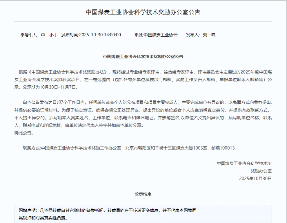 公司榮獲2025年度中國煤炭工業(yè)協(xié)會科學技術(shù)獎二等獎