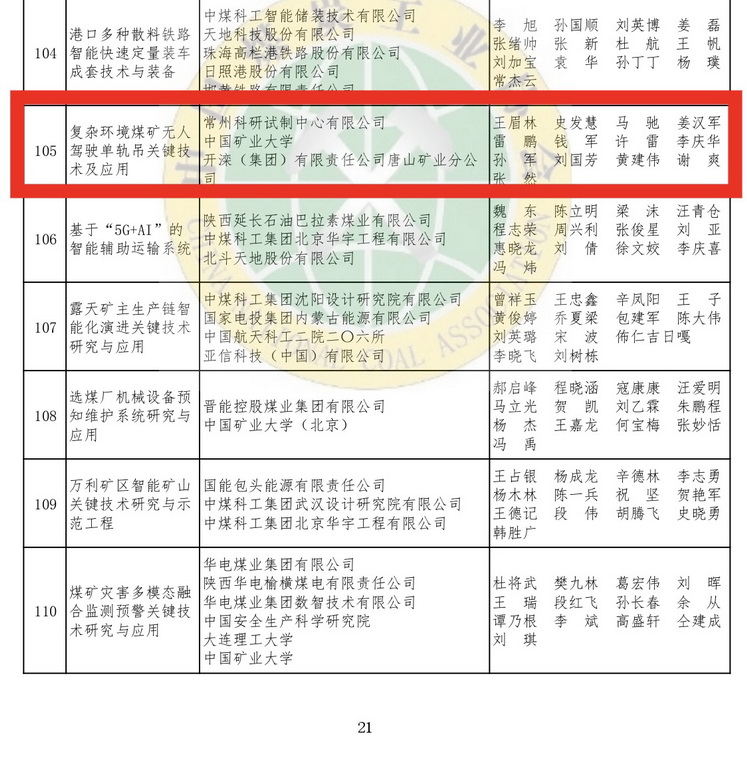 近日,從中國煤炭工業(yè)協(xié)會傳來喜訊,常州科研試制中心有限公司申報的《復(fù)雜環(huán)境煤礦無人駕駛單軌吊關(guān)鍵技術(shù)及應(yīng)用》項目經(jīng)過專家評審、評審委員會審定后順利通過公示,榮獲2025年度中國煤炭工業(yè)協(xié)會科學技術(shù)獎二等獎。