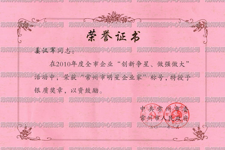 2、常州科研試制中心有限公司被鐘樓區(qū)授予納稅十強企業(yè),授牌省工程技術研究中心。公司董事長兼總經理姜漢軍被鐘樓區(qū)授予優(yōu)秀企業(yè)家的光榮稱號。