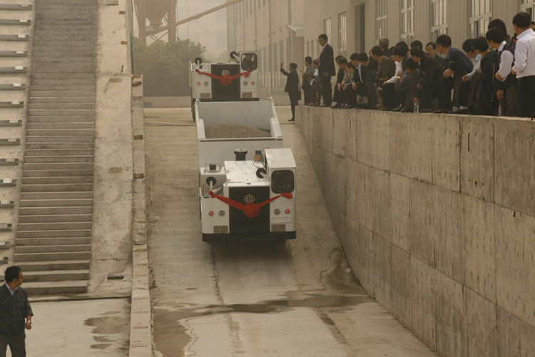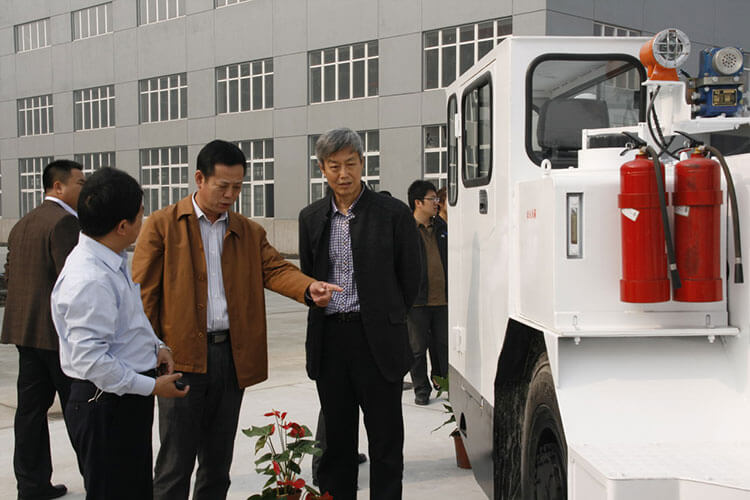 會議期間,參會專家前往公司老廠區及新廠區進行現場參觀,觀摩了“WC10E防爆柴油無軌膠輪車”和“WC1E/WC12RE防爆指揮車”在6°、12°、14°、15°上的爬坡、坡道駐車、坡道起動演示和顛簸通過、加速性能等演示。根據項目匯報及現場展示情況,專家組對項目進行了質詢及討論,給予產品充分肯定和高度評價,形成了鑒定意見:產品具有自主知識產權,填補了國內空白,其技術性能處于國際先進水平。