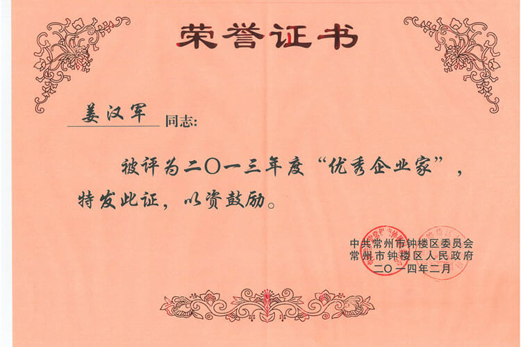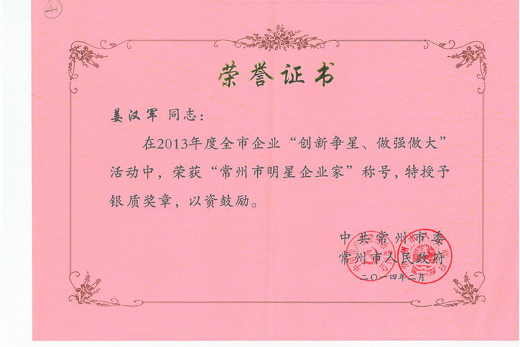 馬年新春,捷報頻傳。公司榮獲常州市“工業四星企業”的榮譽稱號,公司董事長兼總經理姜漢軍被常州市委、市政府授予“工業明星企業家”的榮譽稱號。