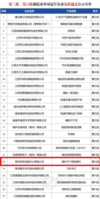 近日,省工信廳公示了第九批制造業單項冠軍企業和復核通過第三批、第六批制造業單項冠軍企業名單。常州科研試制中心有限公司自主研發的煤礦井下用防爆車憑借卓越技術實力、穩定市場表現和持續創新能力,成功通過第六批制造業單項冠軍企業復核,正式保留該項國家級榮譽稱號。